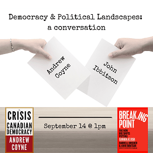 Have you heard? The library in partnership with White Pine Books is presenting an afternoon discussion with Andrew Coyne and John Ibbitson. The theme is Democracy and Political Landscapes. Tickets are free, but you must register to attend. We’ve reached seating capacity of 200 attendees. Please fill out the wait list form and we will be in touch as soon as space(s) become available for you.