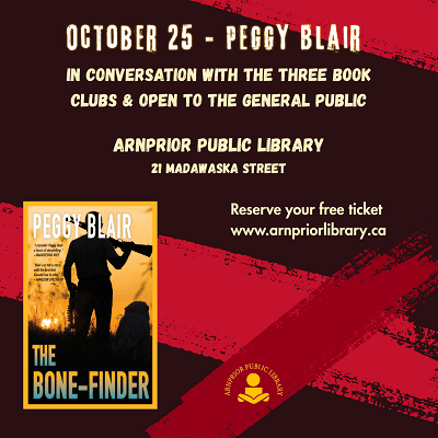 The library’s three book clubs have joined forces and will be hosting mystery author Peggy Blair for an afternoon of discussion centered on her new release The Bone-Finder. The general public is invited to attend. We’re asking those interested in attending to please register so that we have a good grasp on attendance for seating and refreshment purposes.