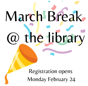 Have a peek at our fantastic lineup of March Break Programs. Registration is now open and please note that we are taking a wait list for any of the events that have filled up. The link to the wait list is on the Youth Services page on this website. You can also download this March Break calendar with registration links. All programs are free of charge with thanks to the Scharf Family Charitable Trust for their ongoing support.